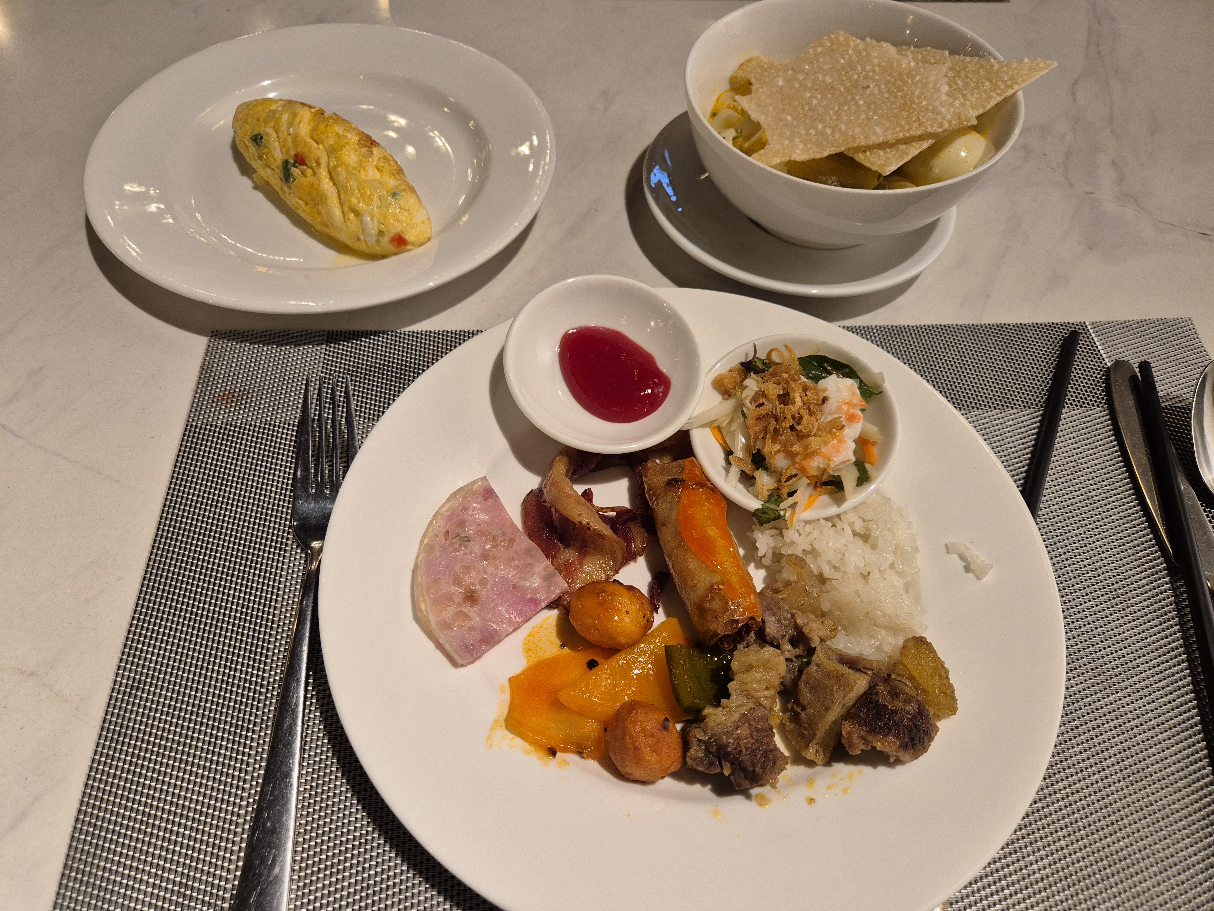 정말 다양한 반찬이 있었고 다 맛있었어요. 즉석에서 조리해주는 메뉴는 쌀국수랑 계란밖에 없어서 그게 조금 아쉽긴 했는데 쌀국수가 매일매일 종류가 달라져서 그것도 너무 신기했고 계란은 우리가 흔히 아는 조식의 에그스테이션 바처럼 오믈렛도 해주시고 프라이도 해주시고 삶은 달걀도 있어서 부족함 없이 먹을 수 있었습니다.