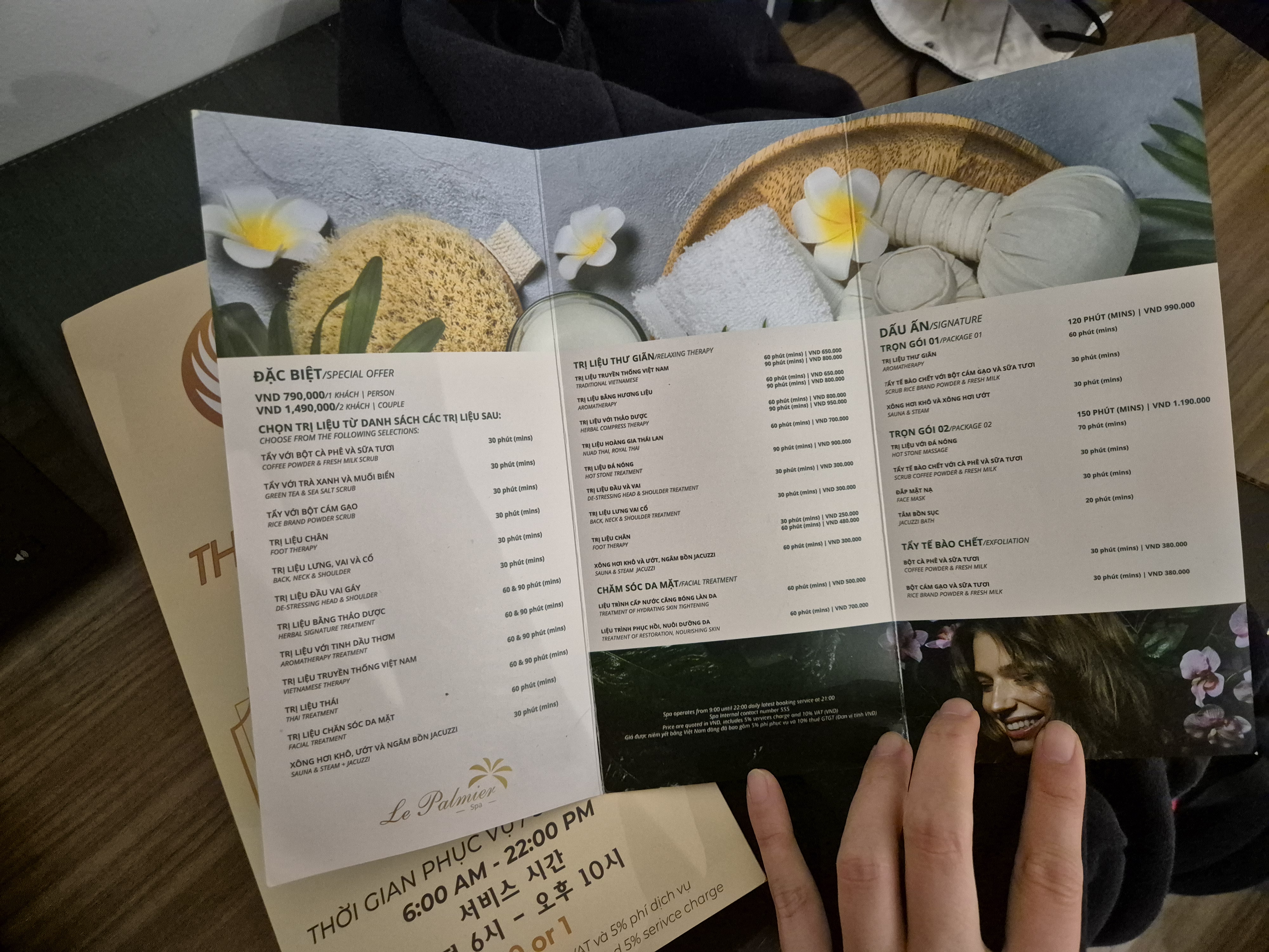 룸 안에 룸서비스, 스파 등과 관련된 호텔 시설 등이 쭉 적힌 룸서비스 안내서도 있었는데요. 베트남어, 영어는 물론 한국말 로도 적혀있었어요.