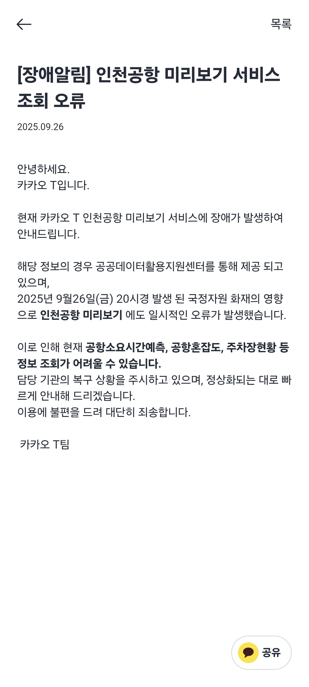 불편을 겪은 여행객분들께는 빠른 복구와 원활한 공항 정보 이용이 재개되기를 바라는 마음입니다.