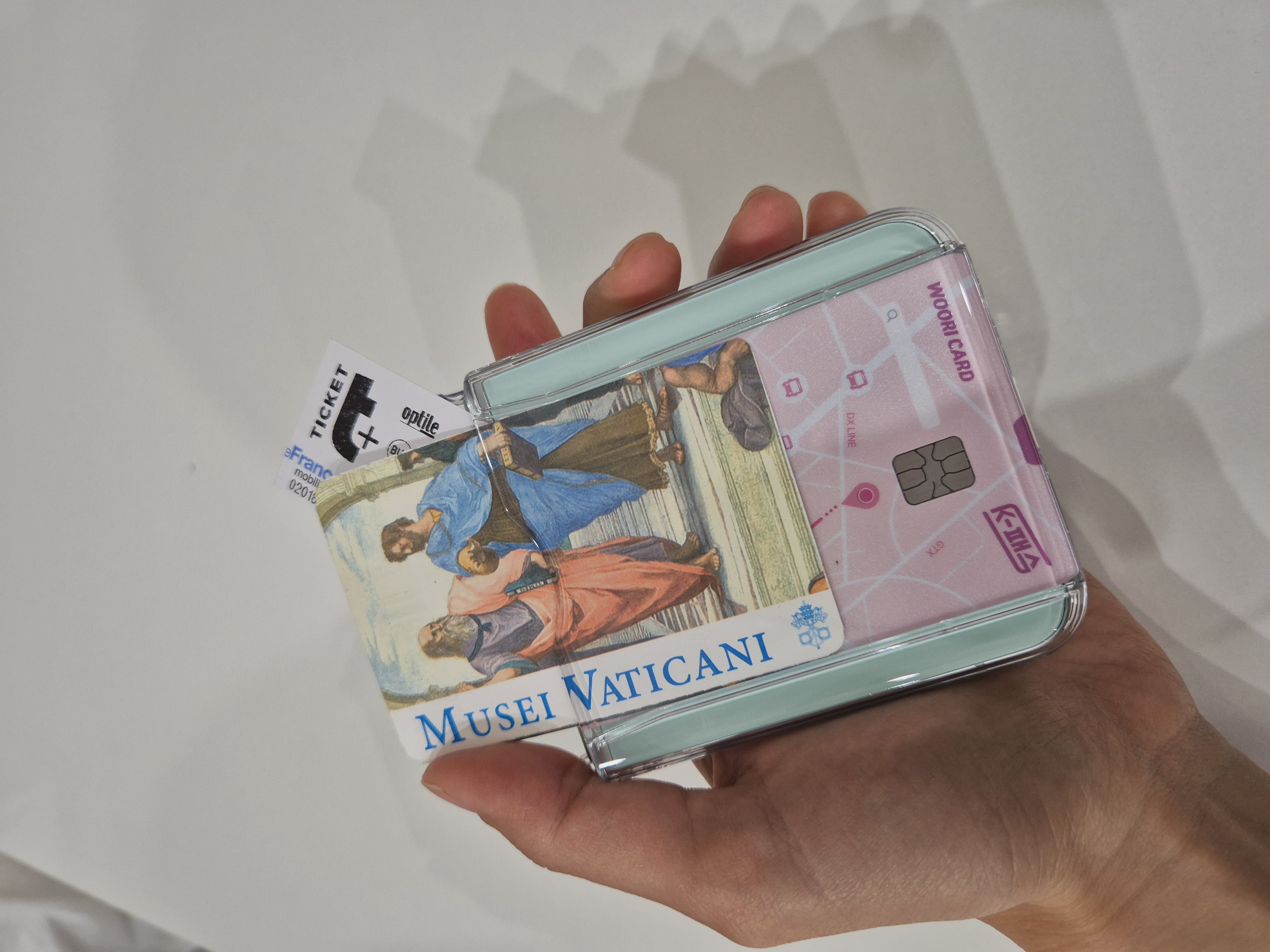 카드는 2개까지 가능하다고 하던데 저는 카드랑 바티칸 박물관 티켓, 프랑스 전철표 티켓 이렇게 넣었더니 티켓은 종이라 얇아서 그런지 3개 다 수월하게 들어갔어요. 아래쪽에 약간 틈을 좁게해서 카드가 덜그럭거리지 않도록 잡아주는 것 같더라구요. 그덕분에 덜그럭거리거나 하는 것도 없어서 만족스러웠습니다.