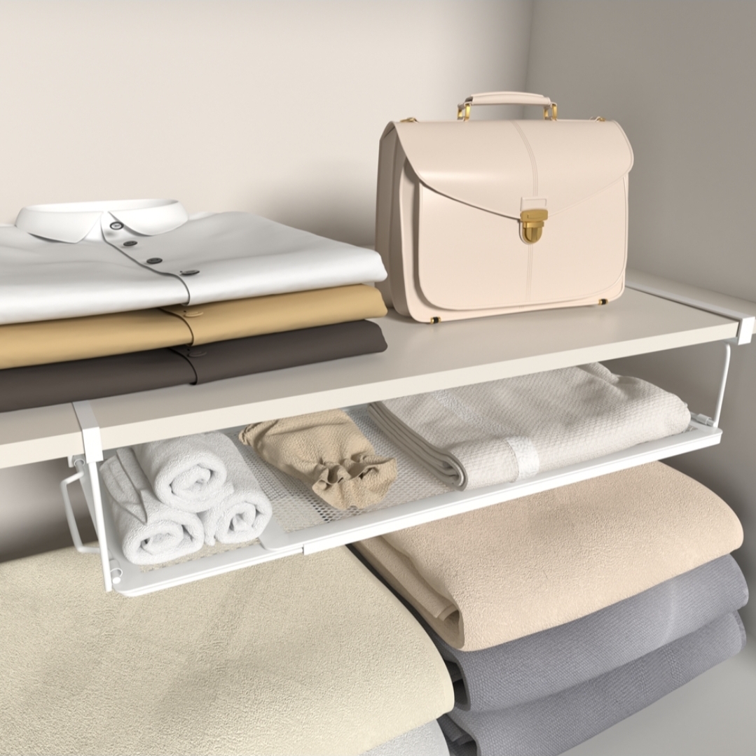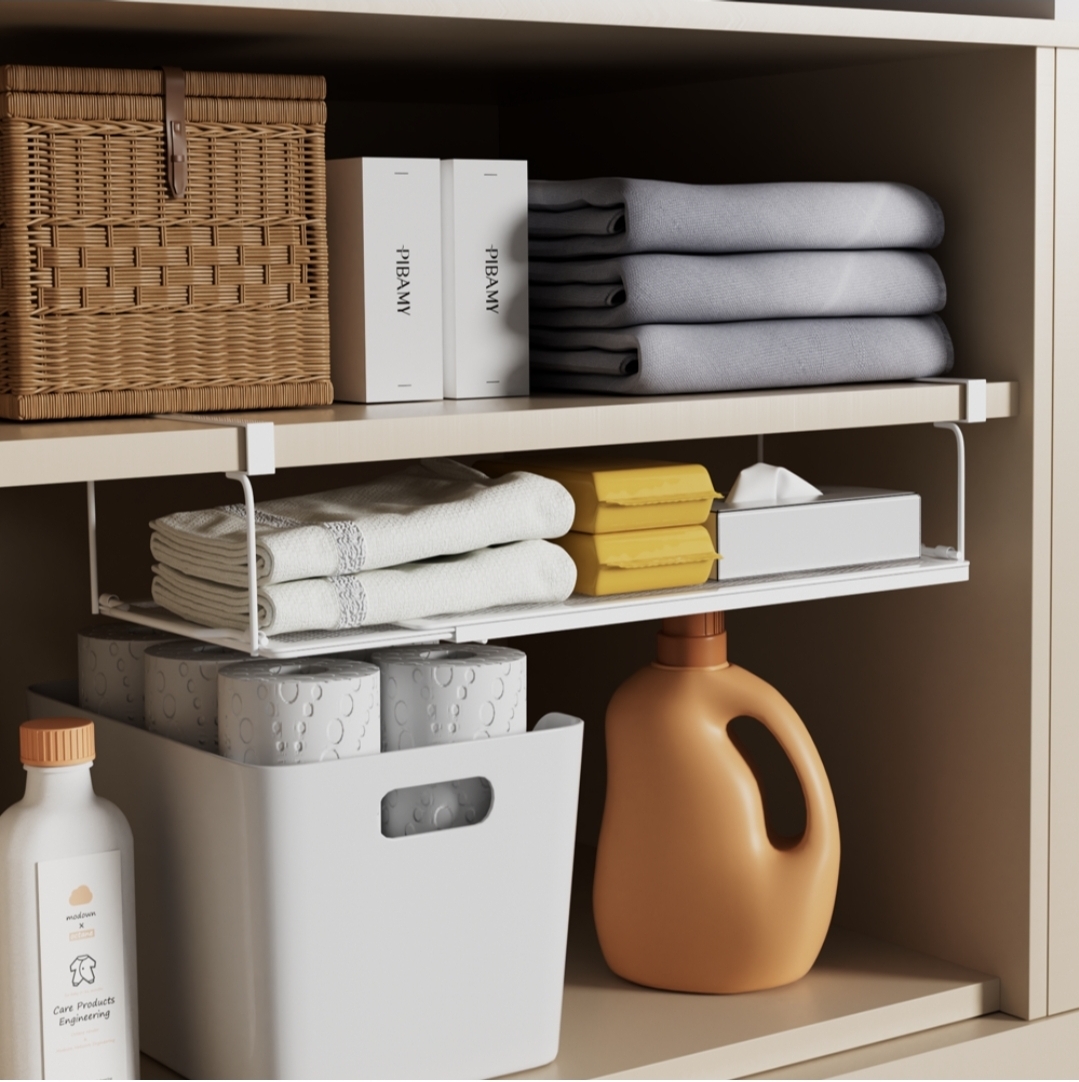 이럴 때 가장 효율적인 아이템이 끼워서 쓰는 확장형 다용도 선반이다. 선반 위에 얇은 층을 하나 추가해 상·하 공간을 정확히 나눠주기 때문에 기존 선반의 활용도가 확실히 달라진다.
