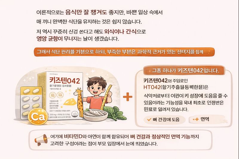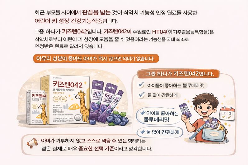 최근 부모들 사이에서 관심을 받는 것이 식약처 기능성 인정 원료를 사용한 어린이 키 성장 건강기능식품입니다. 그중 하나가 키즈텐042입니다. 키즈텐042의 주원료인 HT042(황기추출물등복합물)은 식약처로부터 어린이 키 성장에 도움을 줄 수 있음이라는 기능성을 국내 최초로 인정받은 원료로 알려져 있습니다. 여기에 비타민D와 아연이 함께 함유되어 뼈 건강과 정상적인 면역 기능까지 고려한 구성이라는 점이 부모 입장에서 눈에 띄었습니다.