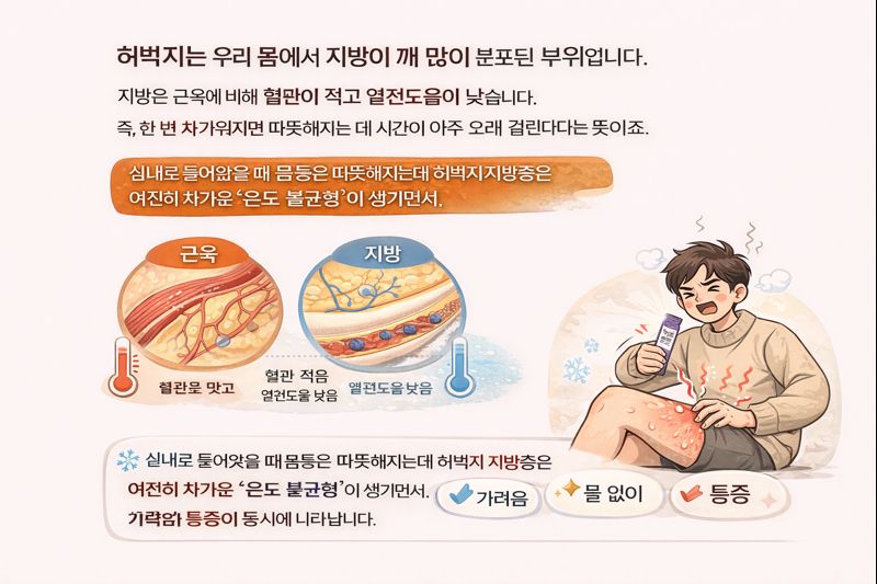 허벅지는 우리 몸에서 지방이 꽤 많이 분포된 부위입니다. 지방은 근육에 비해 혈관이 적고 열전도율이 낮습니다. 즉, 한 번 차가워지면 따뜻해지는 데 시간이 아주 오래 걸린다는 뜻이죠. 실내로 들어왔을 때 몸통은 따뜻해지는데 허벅지 지방층은 여전히 차가운 '온도 불균형'이 생기면서, 혈관이 급팽창하고 신경을 강하게 자극해 가려움과 통증이 동시에 나타납니다.