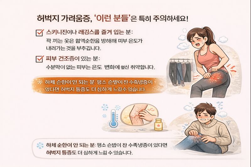 * 스키니진이나 레깅스를 즐겨 입는 분: 꽉 끼는 옷은 혈액순환을 방해해 피부 온도가 내려가는 것을 부추깁니다.